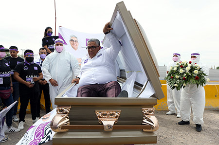 وقال كارلوس مايورغا المرشح البرلماني عن حزب "إنكوينترو سوليداريو" في ولاية شيواوا شمال المكسيك، إنه يعبّر من خلال هذه الخطوة عن رسالة مفادها أن الناس يموتون بسبب "لا مبالاة" السياسيين.